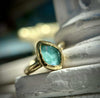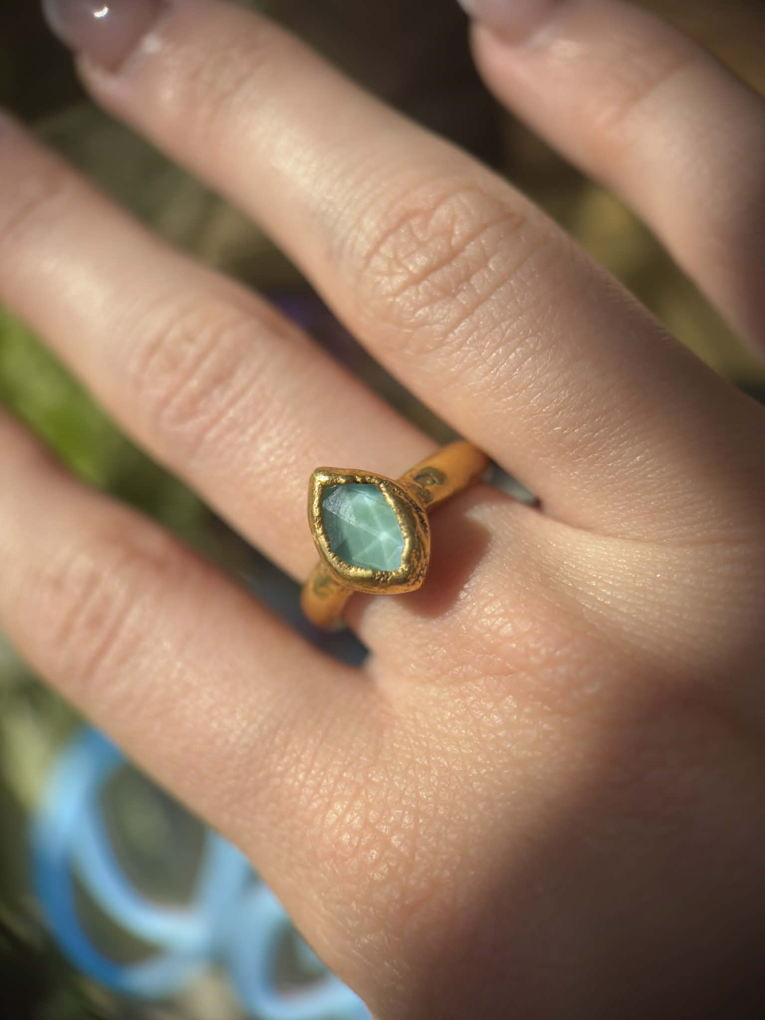 An alchemy of sunlight and seawater, the Sealight ring brings the meeting place of ocean and sky down to your finger. These one-of-a-kind rings are crafted to resemble the sunlight / saltwater refraction pattern seen on sandy bottoms along Hawaiian shorelines. The holographic effect is achieved by light passing through facetted quartz and being patterned onto the surface of Arizona turquoise. This ring features an elegant open ended spiral design, which allows for adjustability while maintaining durability and strength.
