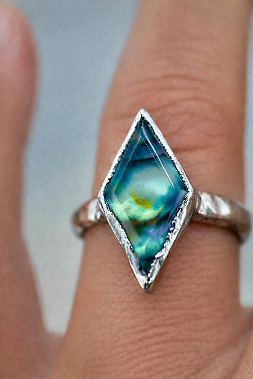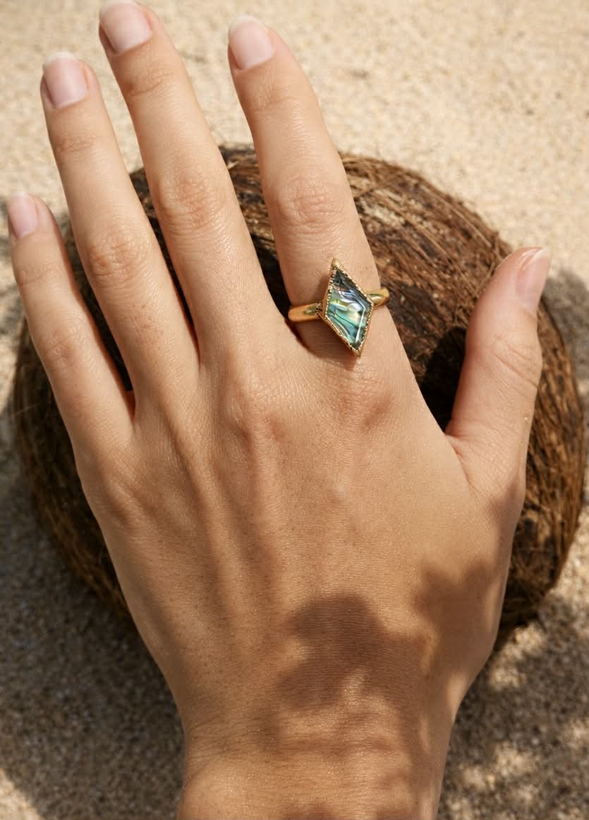 Shimmering with the mystical colors of the reef, this abalone ring seems as if it was just discovered at the bottom of the ocean, waiting centuries to be found. Abalone properties focus on emotional support and stability, its iridescent field of color inviting us to take a closer and deeper look into our own hearts and souls. The Deep See rings feature clear-quartz top layers that elevate abalone as a material and help lens and focus light, which helps to bring out the shell's natural iridescent color.
