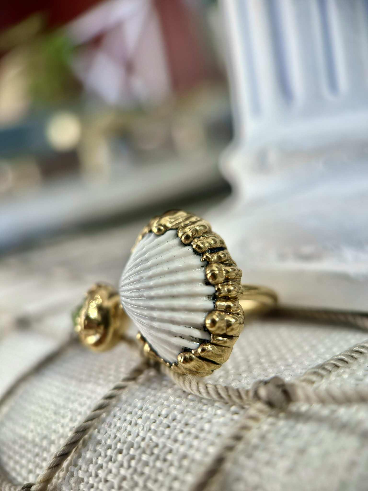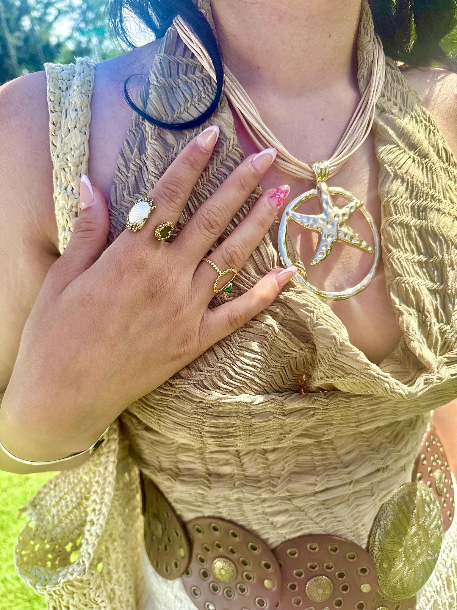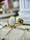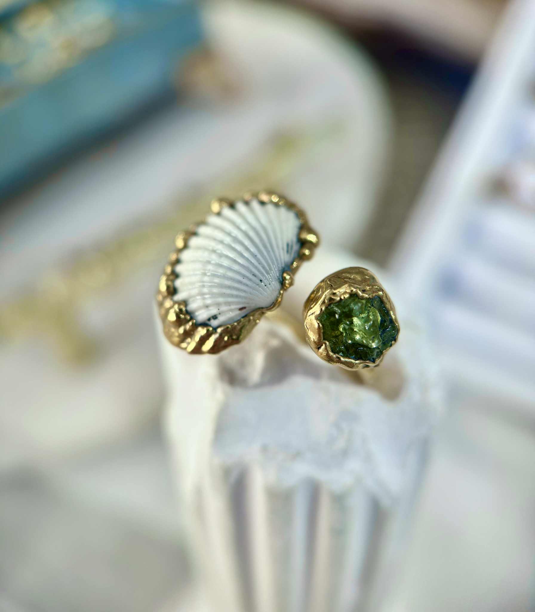 This unique double-ring featuring seashell and raw peridot (otherwise known as olivine) is one of our classic designs that has stayed popular for good reason. Adjustability makes it a wonderful gift and its perfect for those who'd like to change the finger its worn on. All of our pieces featuring shells have been reenforced to ensure durability and strength.
