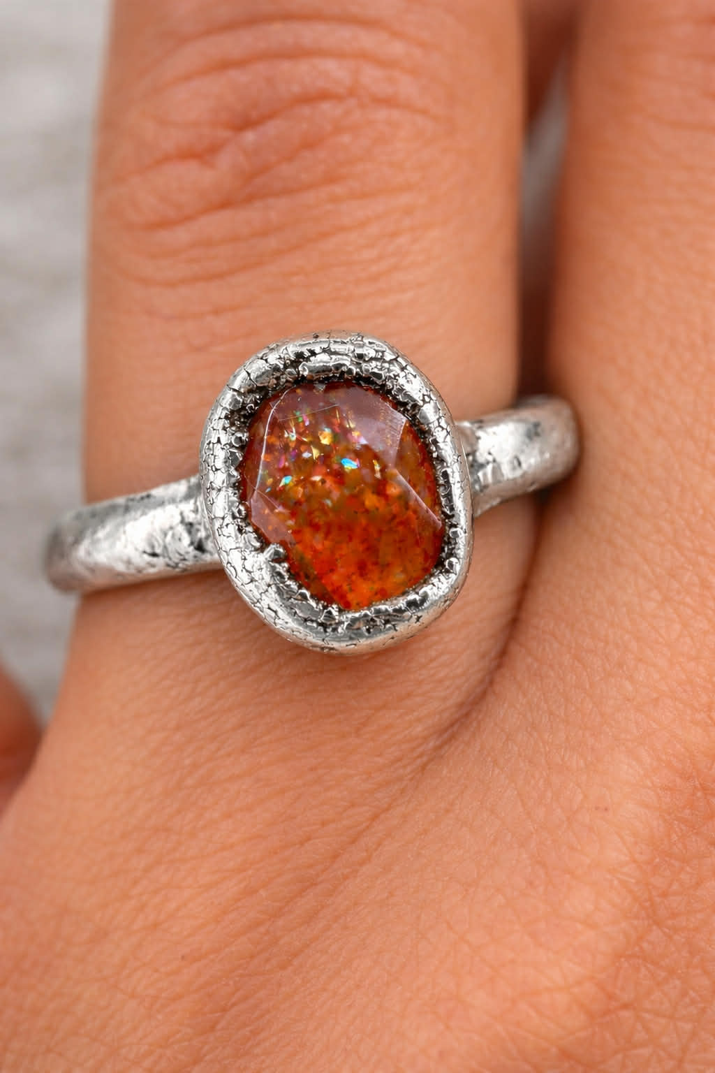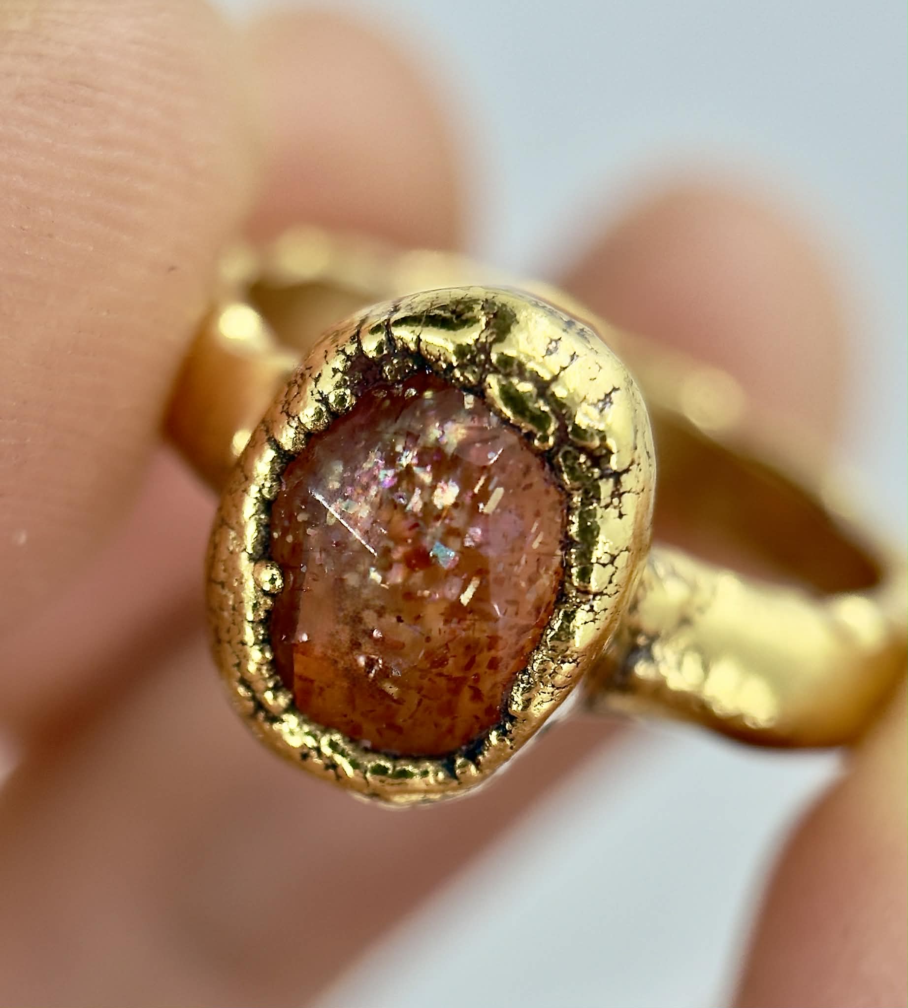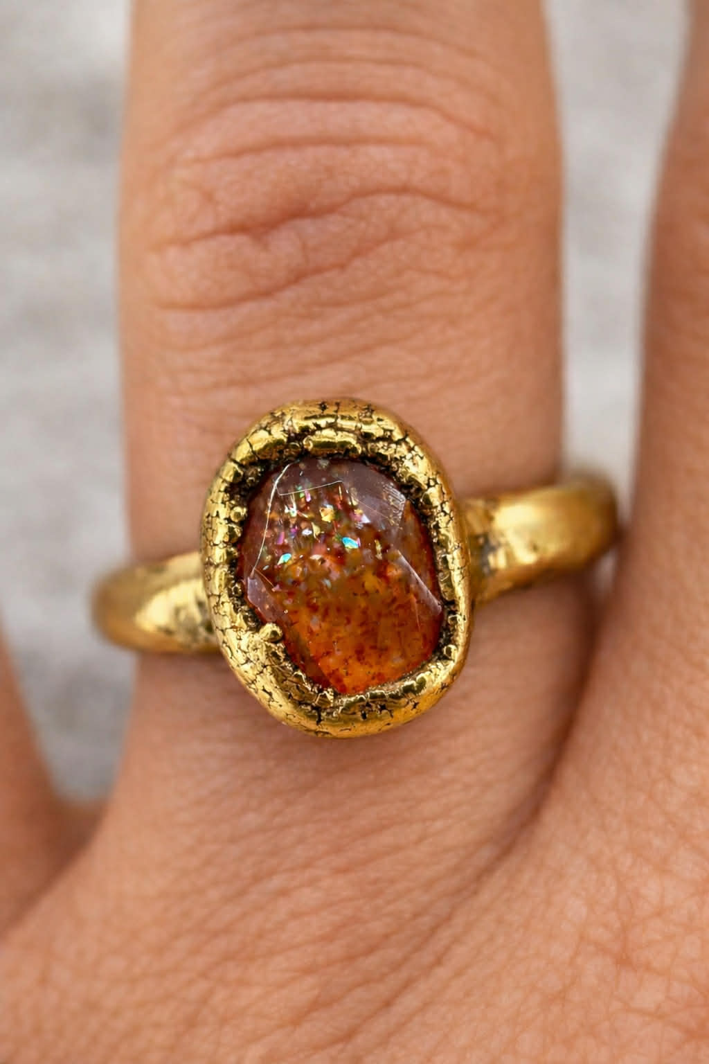 Warm and luminous, this sunstone ring glows from within, scattered with iridescent gold flecks that shimmer like sunlight dancing across an open sea. Each movement reveals a soft, fiery sparkle, echoing the eternal conversation between the sun above and the ocean below. Long honored by ancient cultures, sunstone was believed to carry the life-giving energy of the sun itself. Sailors and navigators once relied on it as a talisman of guidance and fortune, trusting its radiant presence to bring clarity, strength, and safe passage across shifting waters.