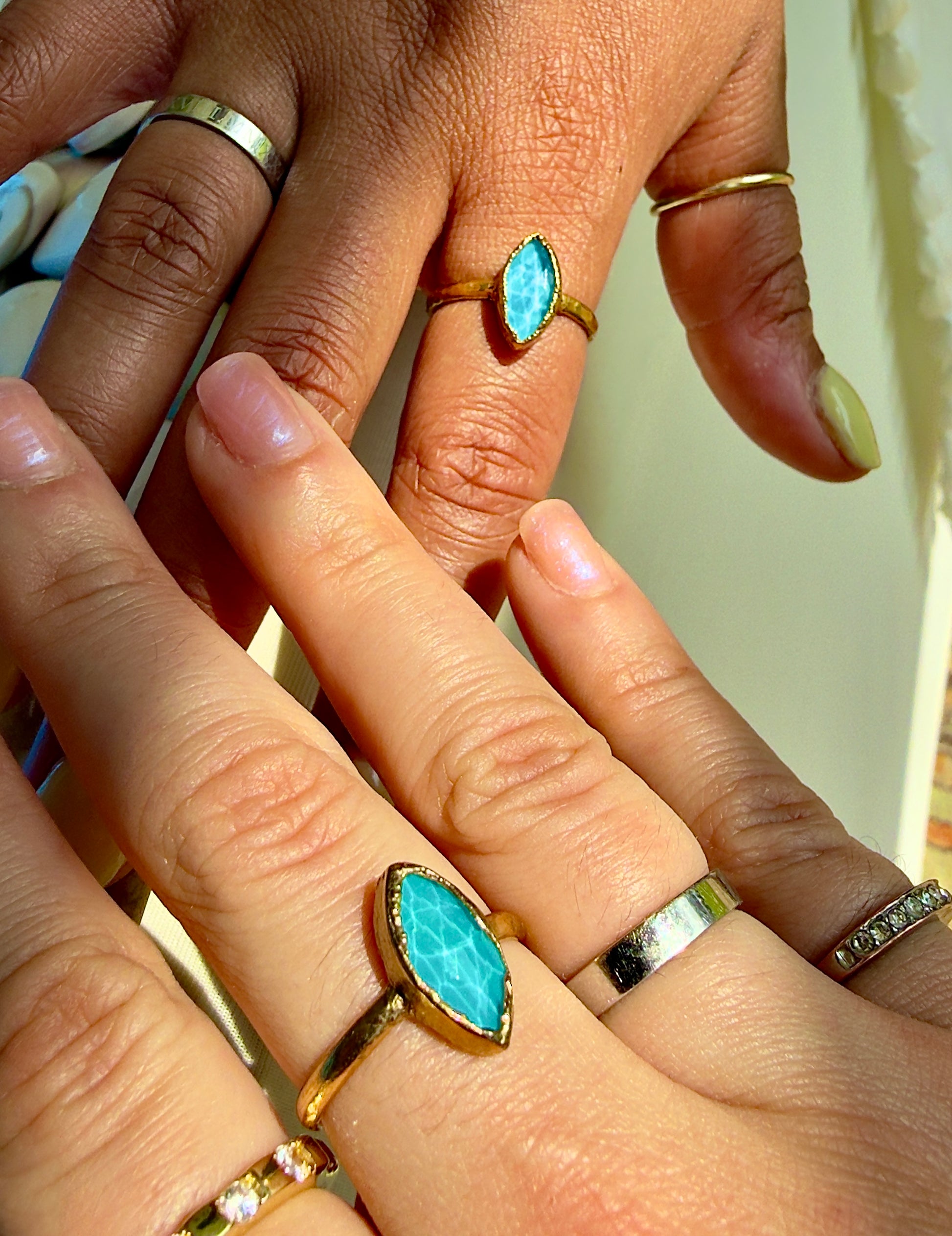 An alchemy of sunlight and seawater, the Sealight ring brings the meeting place of ocean and sky down to your finger. These one-of-a-kind rings are crafted to resemble the sunlight / saltwater refraction pattern seen on sandy ocean bottoms along Hawaiian shorelines. The holographic effect is achieved by bright light passing through facetted aura quartz and being patterned onto the surface of reef-blue turquoise.